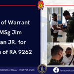 On February 21, 2022 at about 1:35PM, Team 9, 10 & BAR of IMEG-Mindanao Field Unit led by PMAJ MUHAIMIN A ASKALANI together with the personnel of San Miguel MPS led by PLT PURISIL LAROT FANILAG, OIC, arrested PMSg Jim Lahagan Lingating Jr, by virtue of Warrant of Arrest for Anti-Violence Against Women and their continue reading : ACTIVE COP ARRESTED FOR FAILURE TO PROVIDE FINANCIAL SUPPORT TO HIS FAMILY