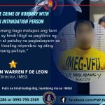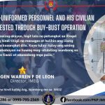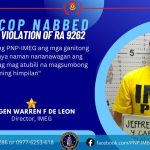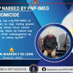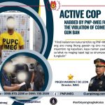 According to the report of PBGEN WARREN F DE LEON, Director, IMEG, at about 9:35 AM of January 31, 2024, joint operatives of Team 4A Luzon Field Unit-IMEG (Lead Unit) together with personnel of IMEG-Counter Intelligence Division and Police Security and Protection Group (PSPG) served a warrant of arrest at Maintenance and Technical Support Division, continue reading : ACTIVE COP NABBED BY PNP-IMEG FOR VIOLATION OF RA 9262